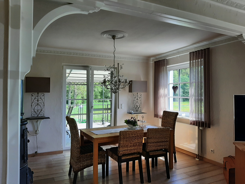 Die Ursprünglichkeit der ehemaligen Mühle wurde bewusst beibehalten, um die ländliche nostalgische Atmosphäre zu bewahren. Das Haus liegt alleinstehend, in ruhiger Lage ca. 300 Meter außerhalb des kleinen Dörfchen Ober Kostenz, inmitten von grünen Wiesen.