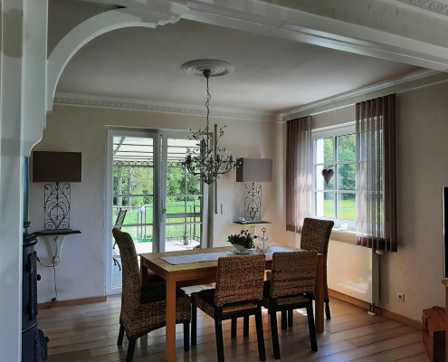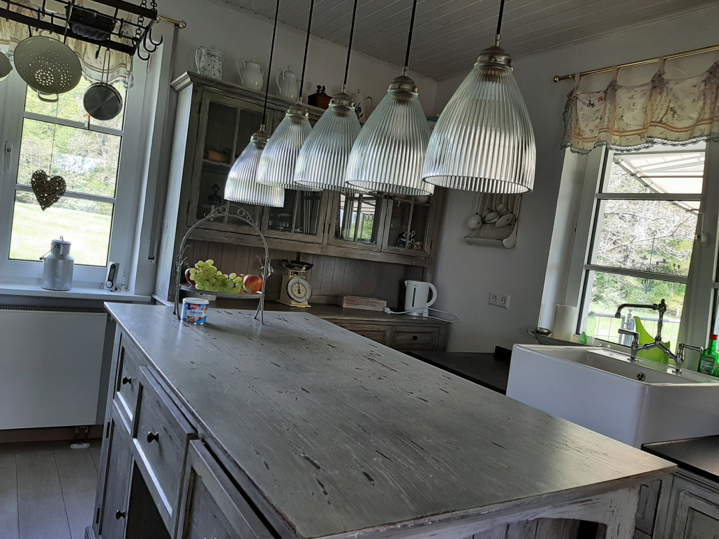 Holzdielen, ausgewählte Möbelstücke, ein alter Kanonenofen und eine französische Landhausküche geben dem Haus seinen Charme.